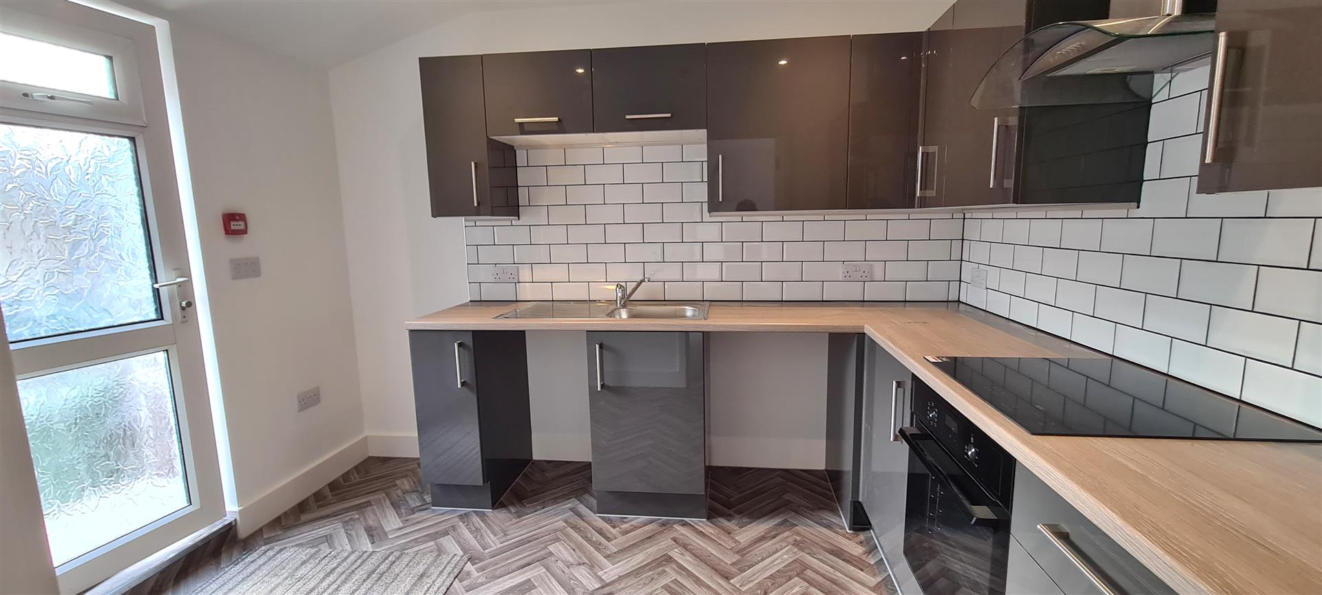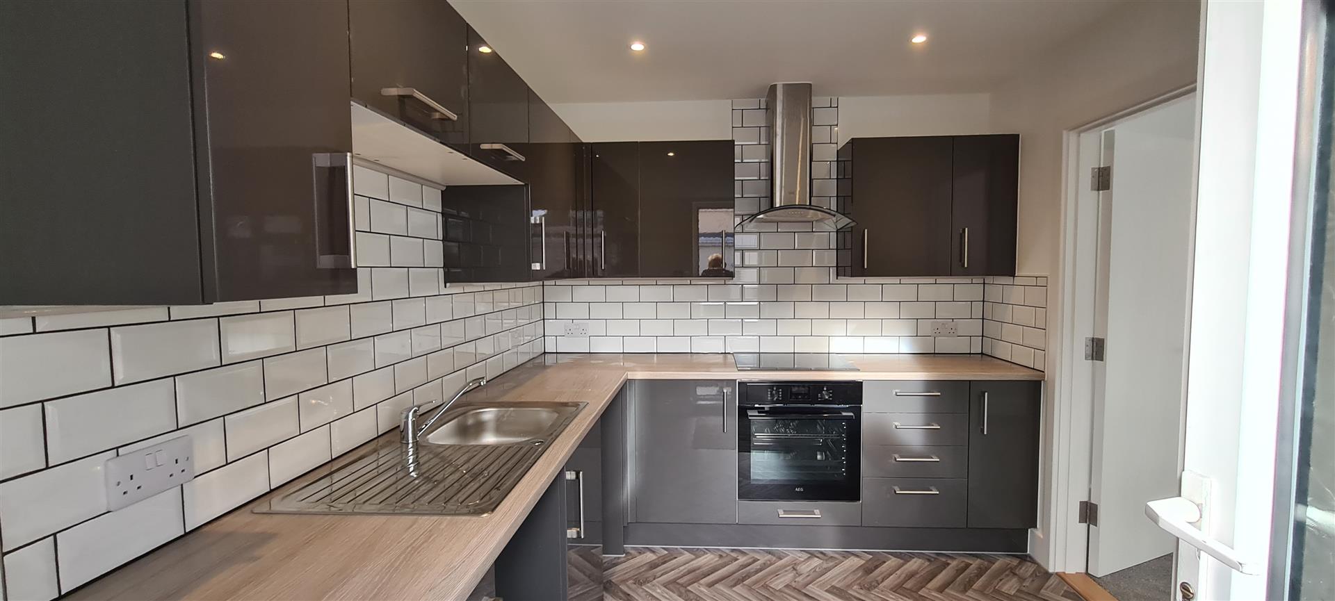 Eat-in Kitchen (3.3 x 2.56 (10'9" x 8'4"))Range of stylish high and low fitted units with integrated 4 ring induction hob with extractor above, free standing fridge/freezer, and washer/dryer. space for dishwasher Room for small table and chairs. Recess lights and wood effect vinyl flooring. Door to exterior.