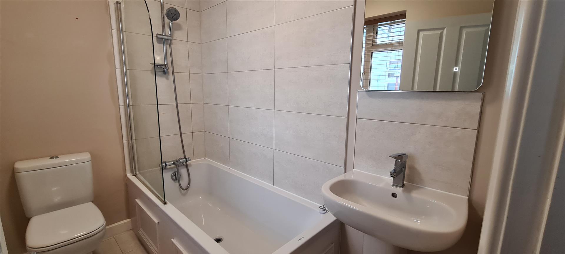 Comprising bath with shower attachment, shower screen, pedestal wash hand basin with touch light mirror, WC and heated towel rail. Tiled flooring. Window to side.